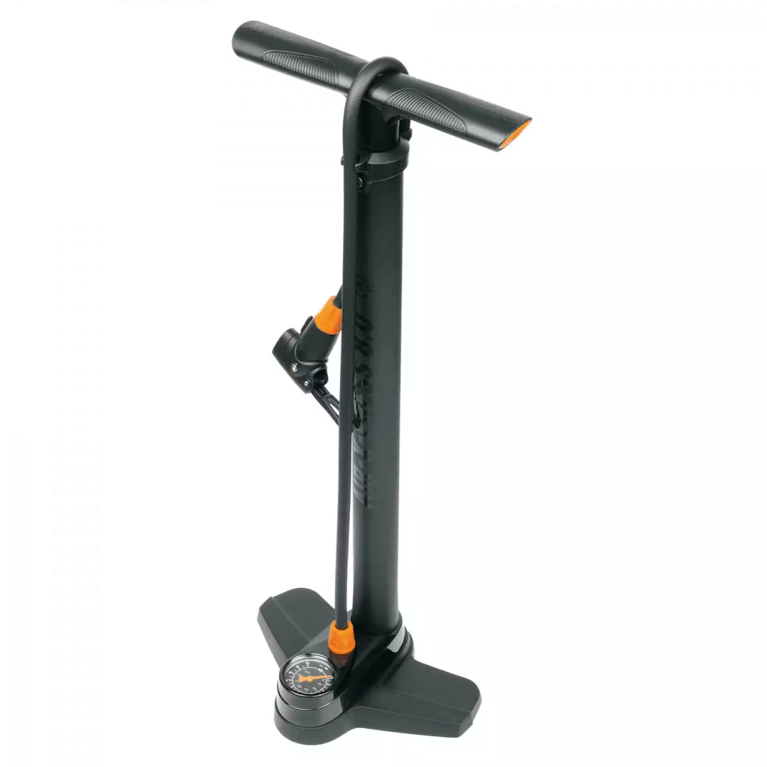 schwarz-orangefarbene Fahrradpumpe wird aus Kunststoff gefertigt und ist 60 Zentimeter