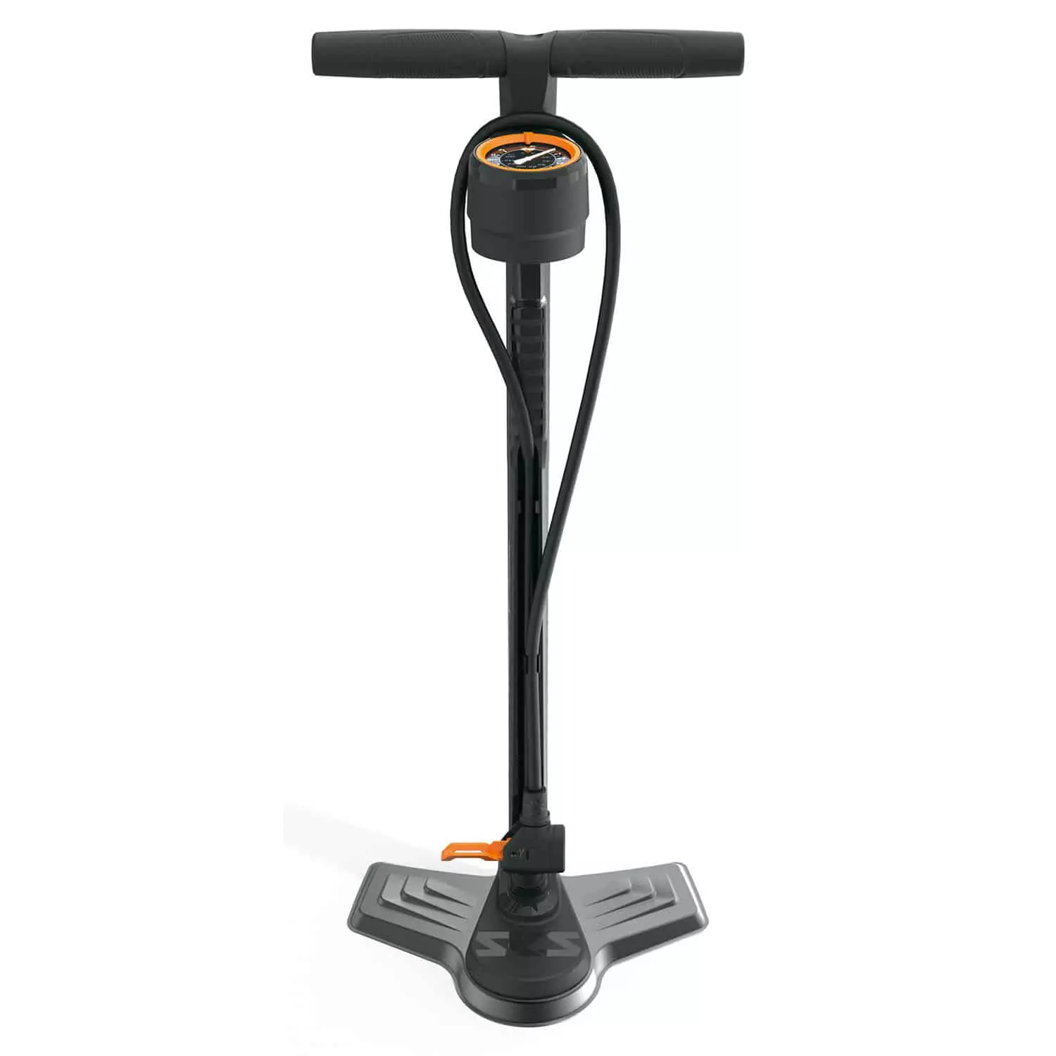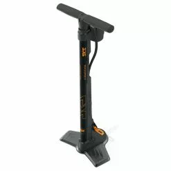 schwarz-orangefarbene Fahrradpumpe ist 71,5 Zentimeter hoch und verfügt