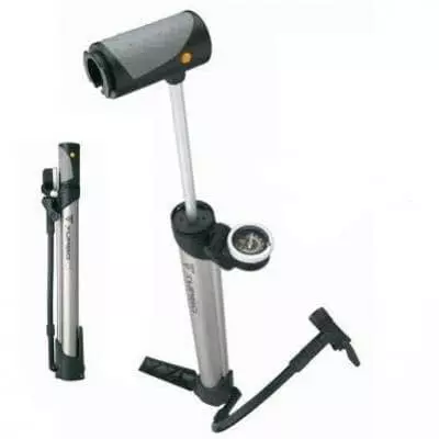 Geniale Kombination aus Stand- und Minipumpe. Schafft schweißlos 11 bar. Präzisionsmanometer. Perfekt fürs Trainingslager. Durch den Universalfixer praktisch überall am Bike zu befestigen.